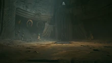 A vaulted, subterranean structure constructed by the Zeffo, the facility was originally constructed as a proving ground and training facility for Zeffo Sages studying the nature of the Life Wind. Carved from the natural stone of the planet, the facility was built to harness the natural electromagnetic forces of the region, while ornamental wind chimes hung from the high ceilings. While the Life Wind was elevated in every aspect of the facility's architecture, the place was eventually converted into a tomb for the honored remains of Sages that had passed on. Chief among the venerated dead was Eilram, a Sage who held a place of significant veneration in Zeffo culture. The final resting place of Eilram was a domed chamber, the walls of which were decorated with an ornate carving of a wroshyr tree. The tomb was guarded by several droid guardians, towering automaton charged with the defense of the sacred chambers and their unplumbed secrets.[1]